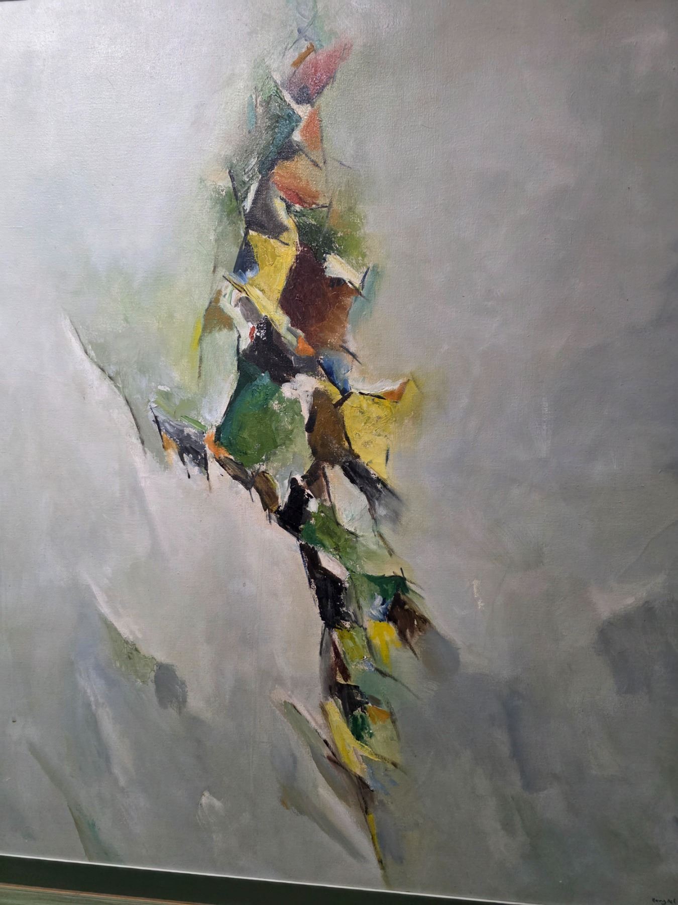 Signed Lain Singh Bangdel Abstract Oil on Canvas Painting "Spring"- Well known Contemporary Nepalese artist (1919-2002)- 44" x 48" Framed. Signed Bangdel on lower right corner and "Spring" on the back of the painting. Similar painting sold this year at Bonhoms Auction in England for £23,000 Pounds (including premium).