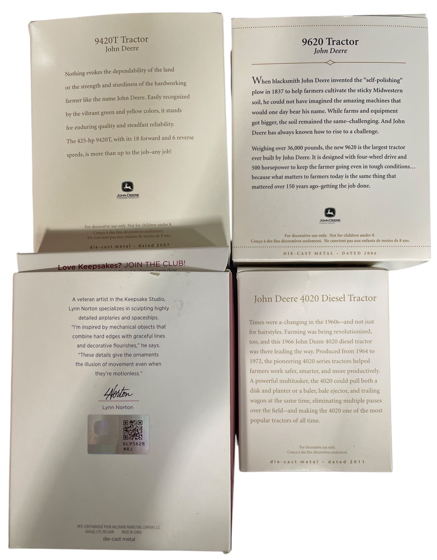 4 Hallmark Keepsake John Deere Ornaments (X390, 4020 Diesel, 9420T, 9620 Tractor)