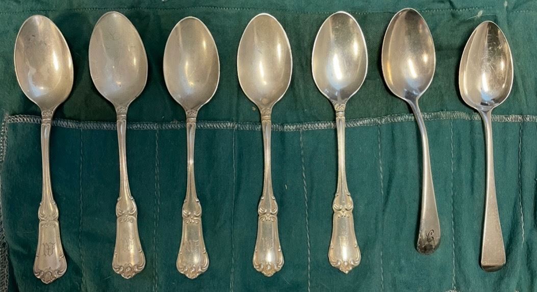 7 Sterling Silver 5 1/2" Teaspoons -1 English & 6 Birks- Total Weight = 162 grams - Monogram Handles.