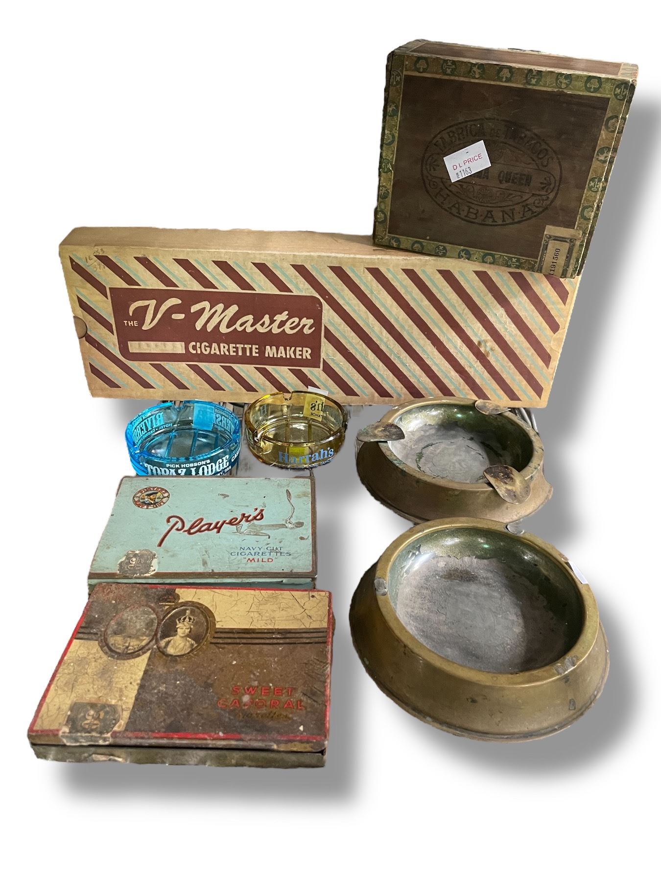 8 Pcs. Lot of Vintage Ash Trays, Cigarette Roller and Cigar Box & Tins
