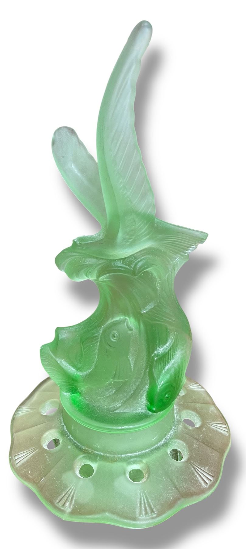 Art Deco Uranium Glass 9" Gull & Fish Flower Frog Centerpiece
