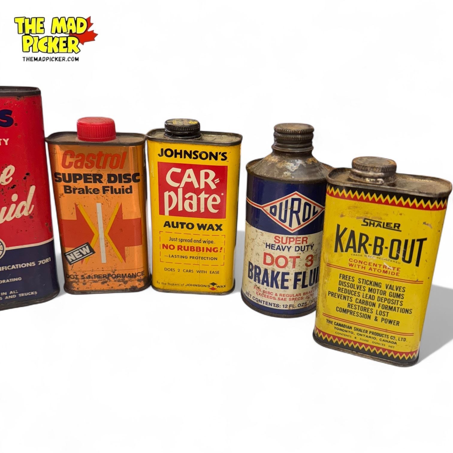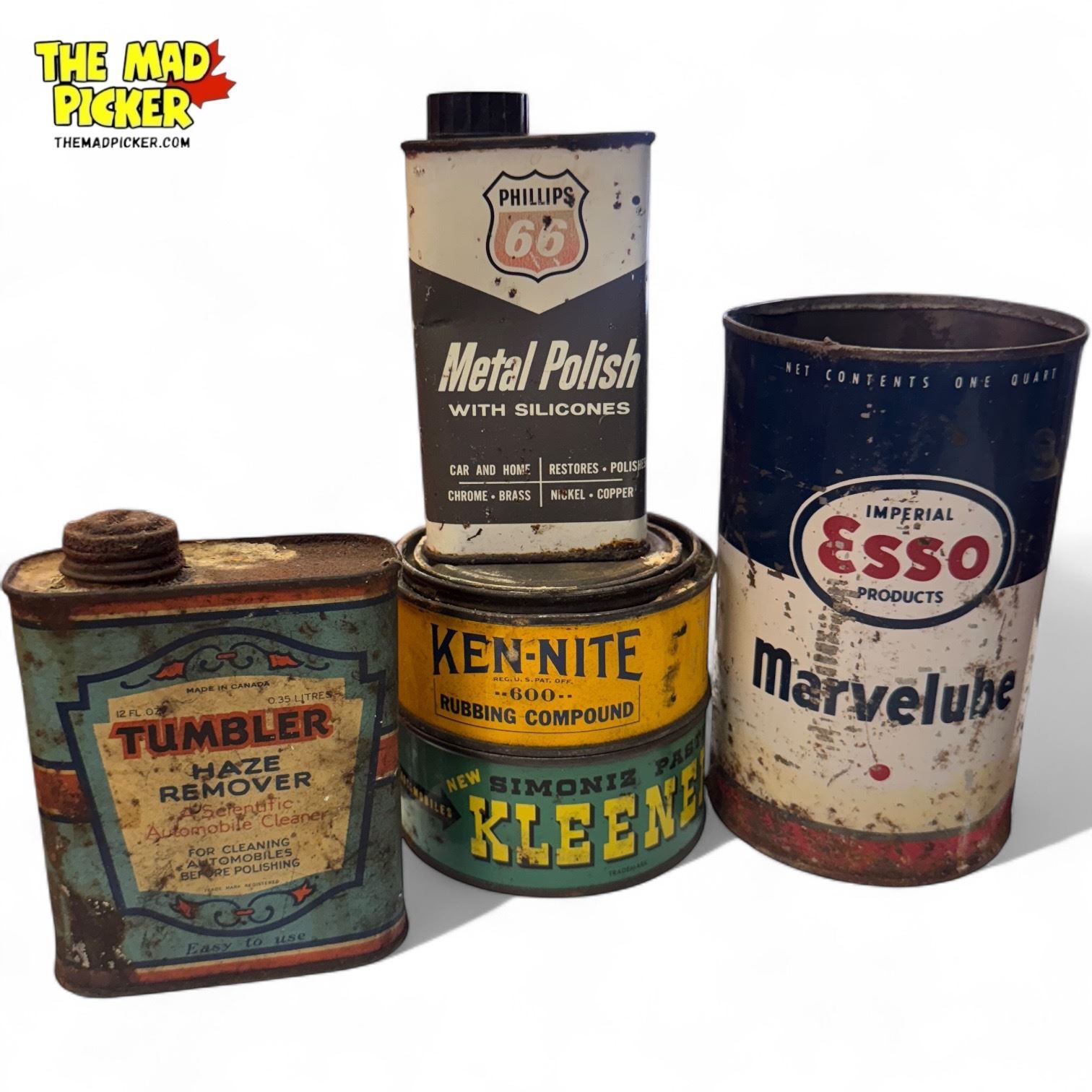 Assorted Automotive Tins Oil & Cleaners : Esso, CIL, Tumbler, Durol, Kennite, Atlas, Castrol, Rotund