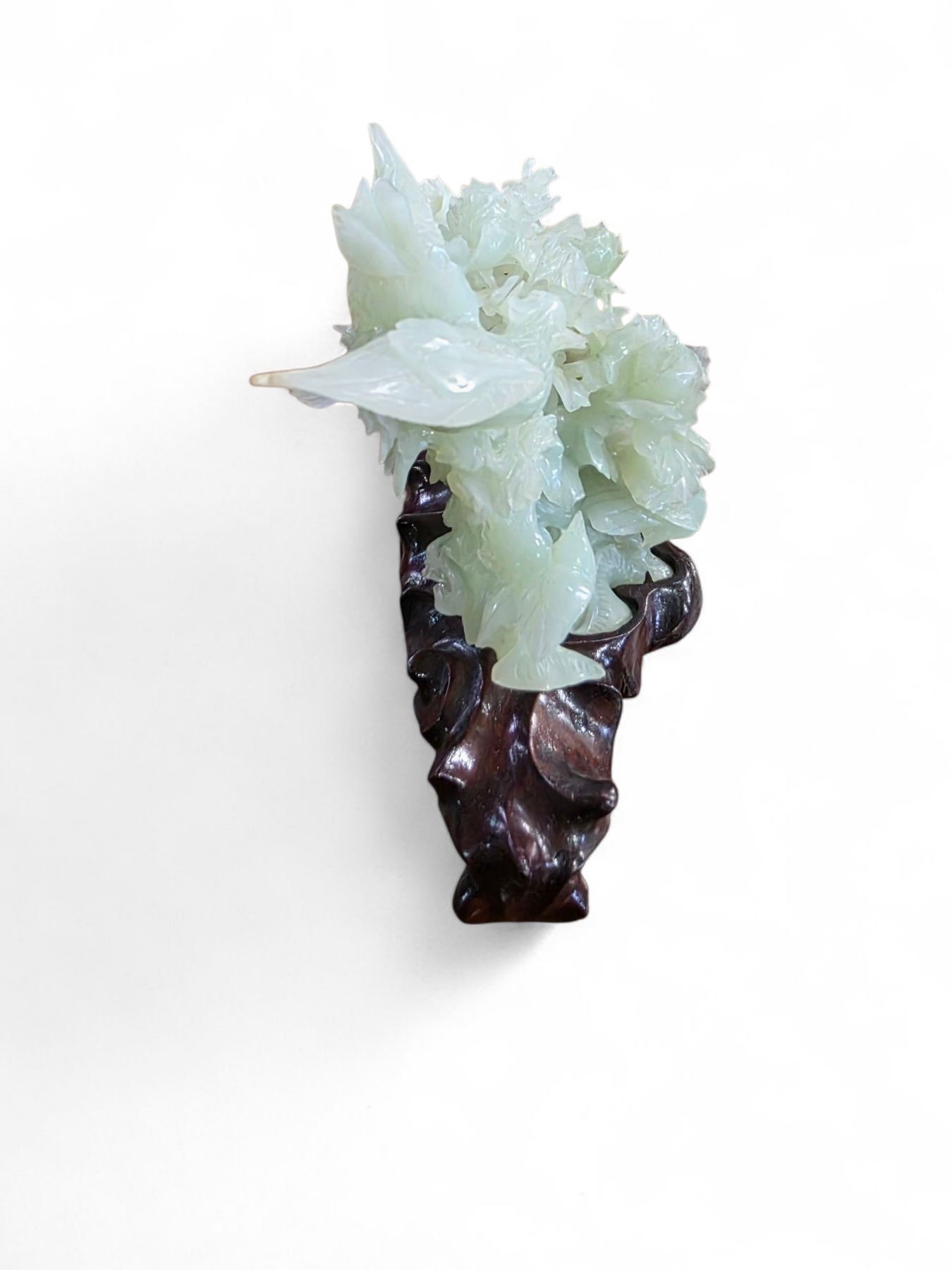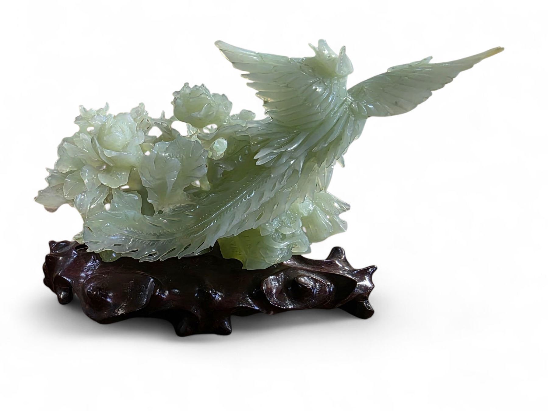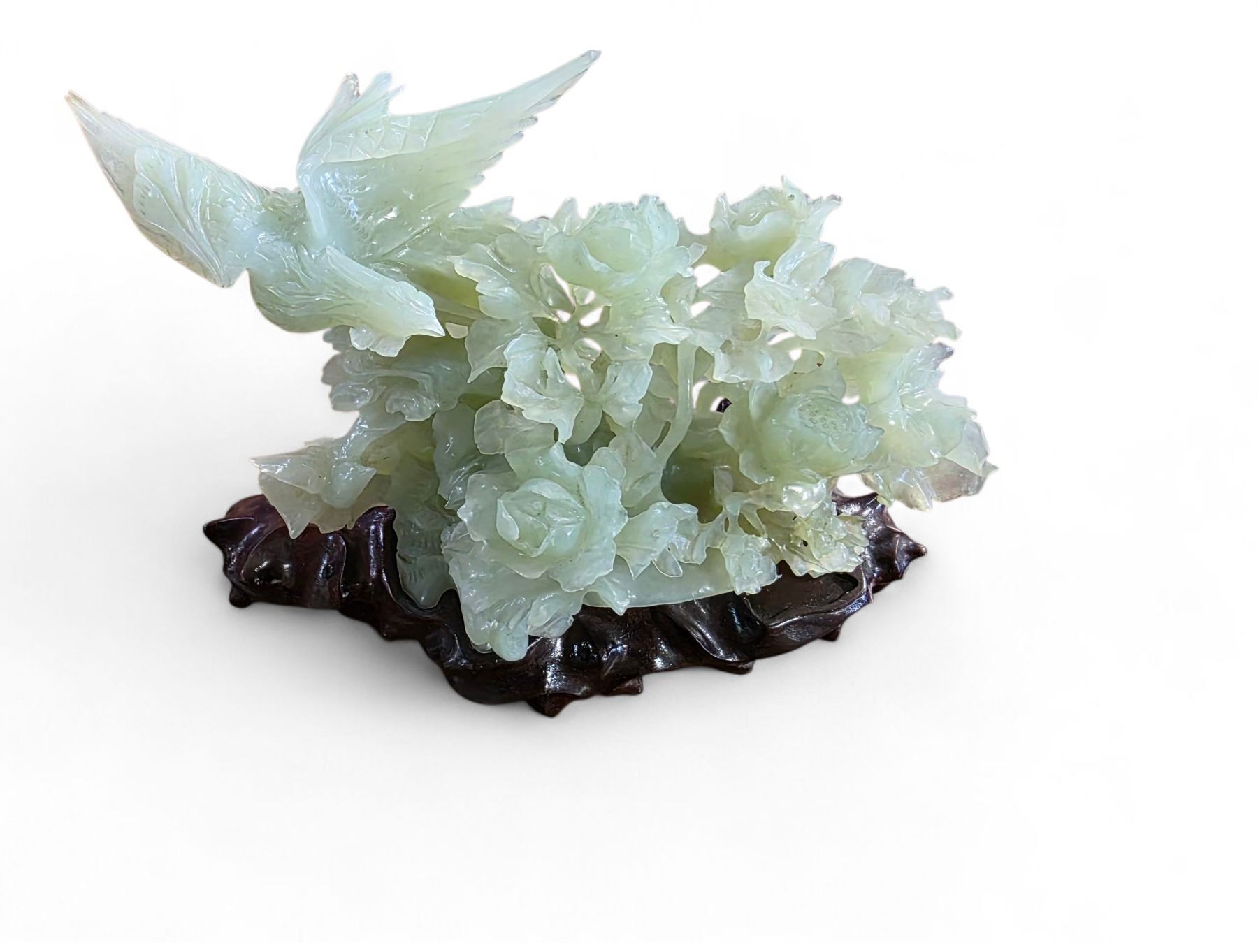 Carved Green Serpentine Stone Floral Statue with Bird on Stand - 6" x 11" x 7" tall