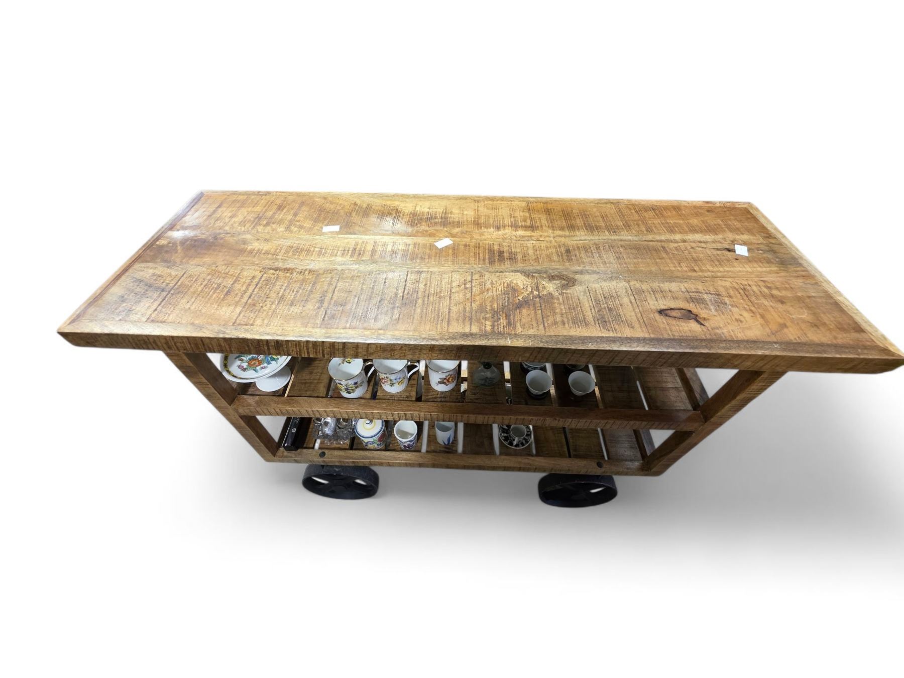 Industrial Mango Wood Console on Iron Wheels - 17" deep x 48" wide x 36" tall. Contents are not included.