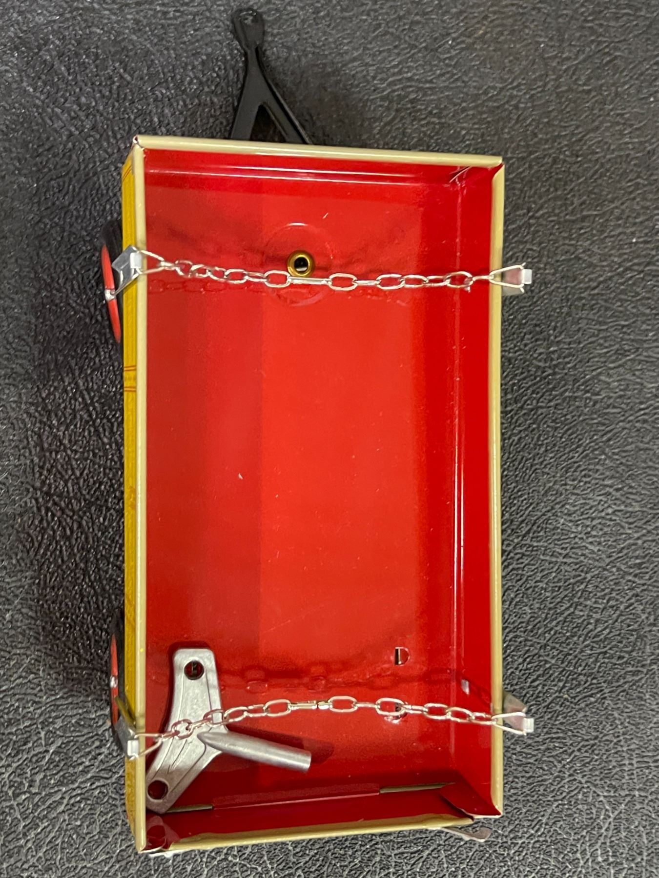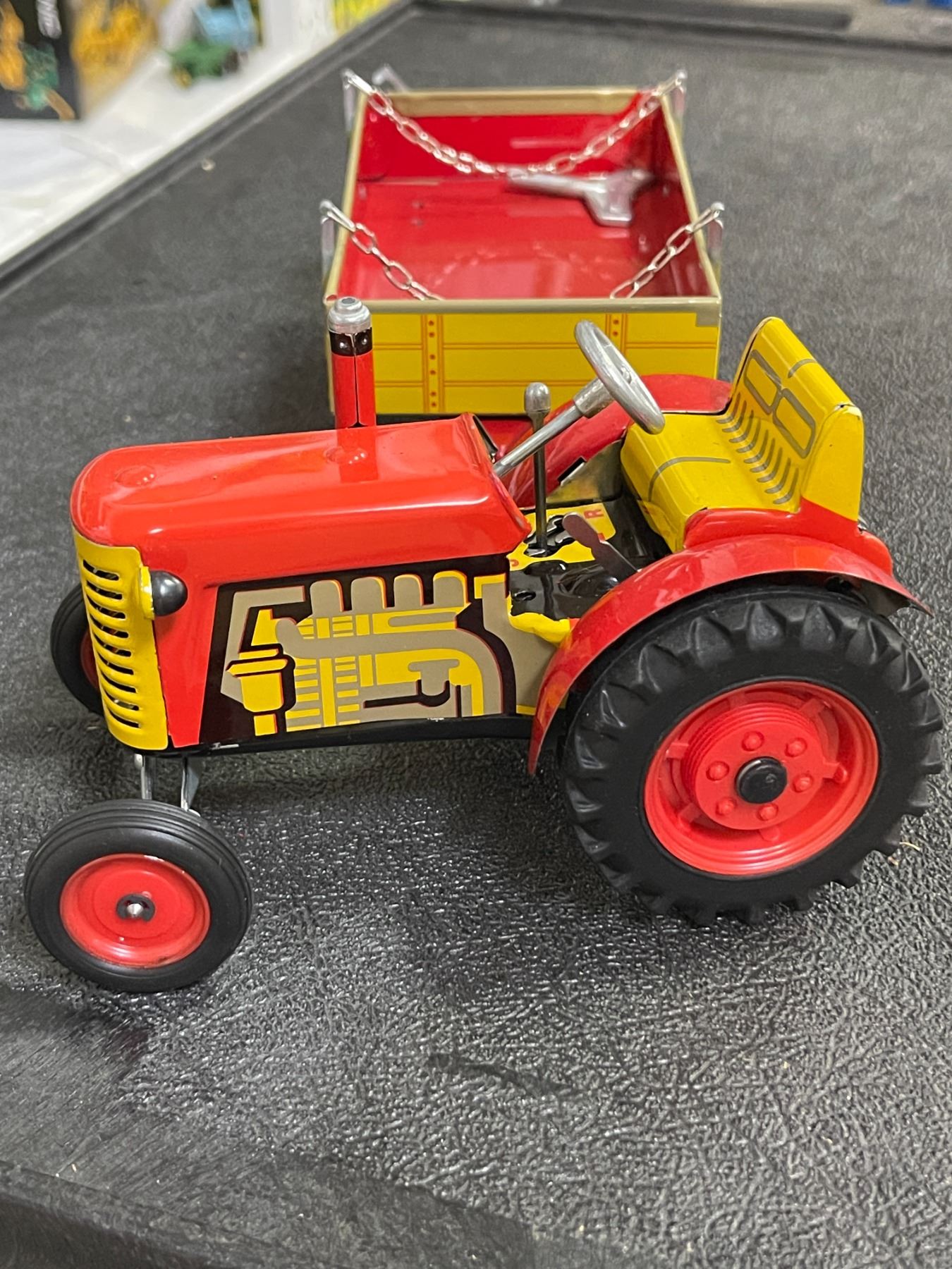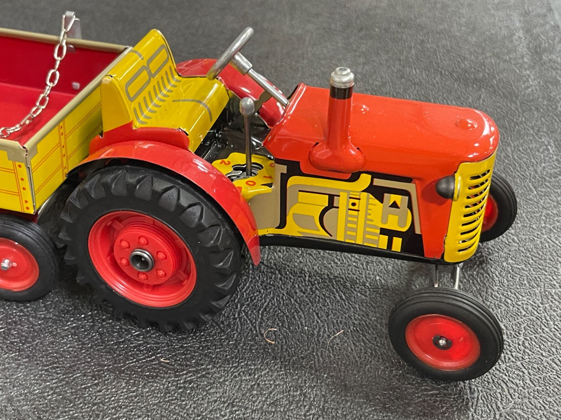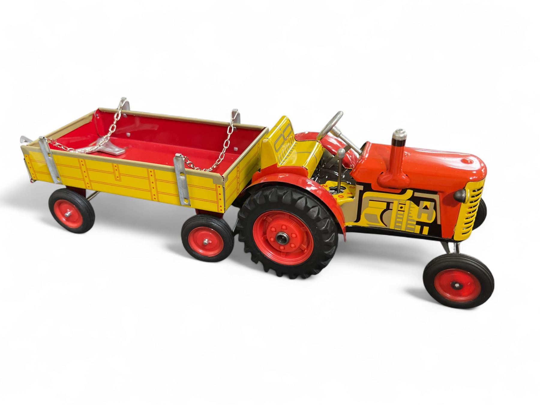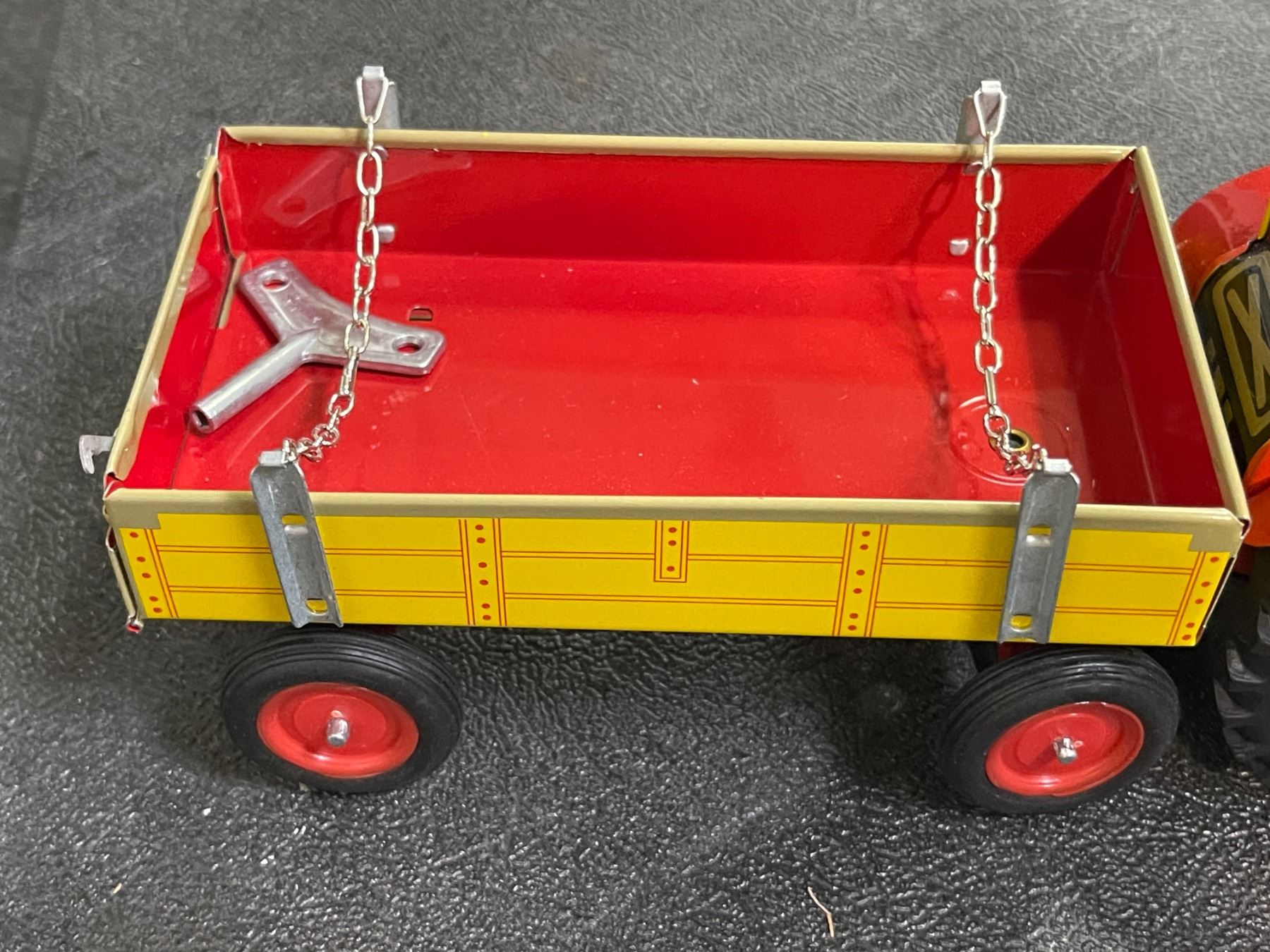 Vintage Tin Wind-Up Tractor with Red & Yellow Wagon - Collectible Farm Toy